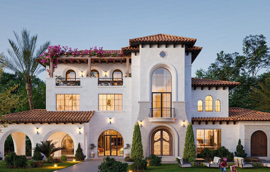 Biệt thự phong cách Địa Trung Hải thường có kiến trúc mái vòm thấp, cửa sổ lớn, hiên ngoài trời rộng rãi.