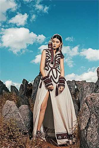 Thêm vào đó, để bộ sưu tập nổi bật nhà thiết kế đã sử dụng các kỹ thuật thêu tay truyền thống, đính cườm, fringing, applique…làm nổi bật các họa tiết được thiết kế hoàn toàn thủ công.