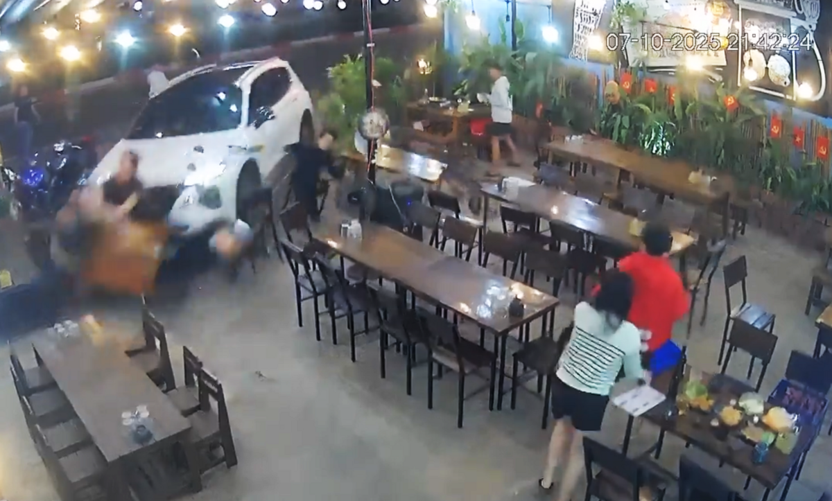Trước đó, khoảng 21h40, mạng xã hội chia sẻ clip một chiếc ôtô con màu trắng chạy ngang qua trước quán có tên Xóm Nhậu, thuộc xã Bình Dương. Khi vừa qua quán nhậu ven đường, xe dừng một lát, sau đó lùi lại chừng 3-4 m, leo lên dải phân cách, rồi lao vào quán.