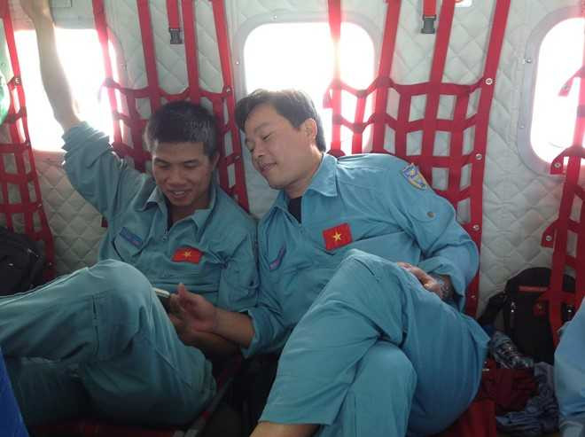 ![]() Trung uý Lê Đức Lam (bên trái) và đồng đội trên một chuyến bay. Ảnh tư liệu. |