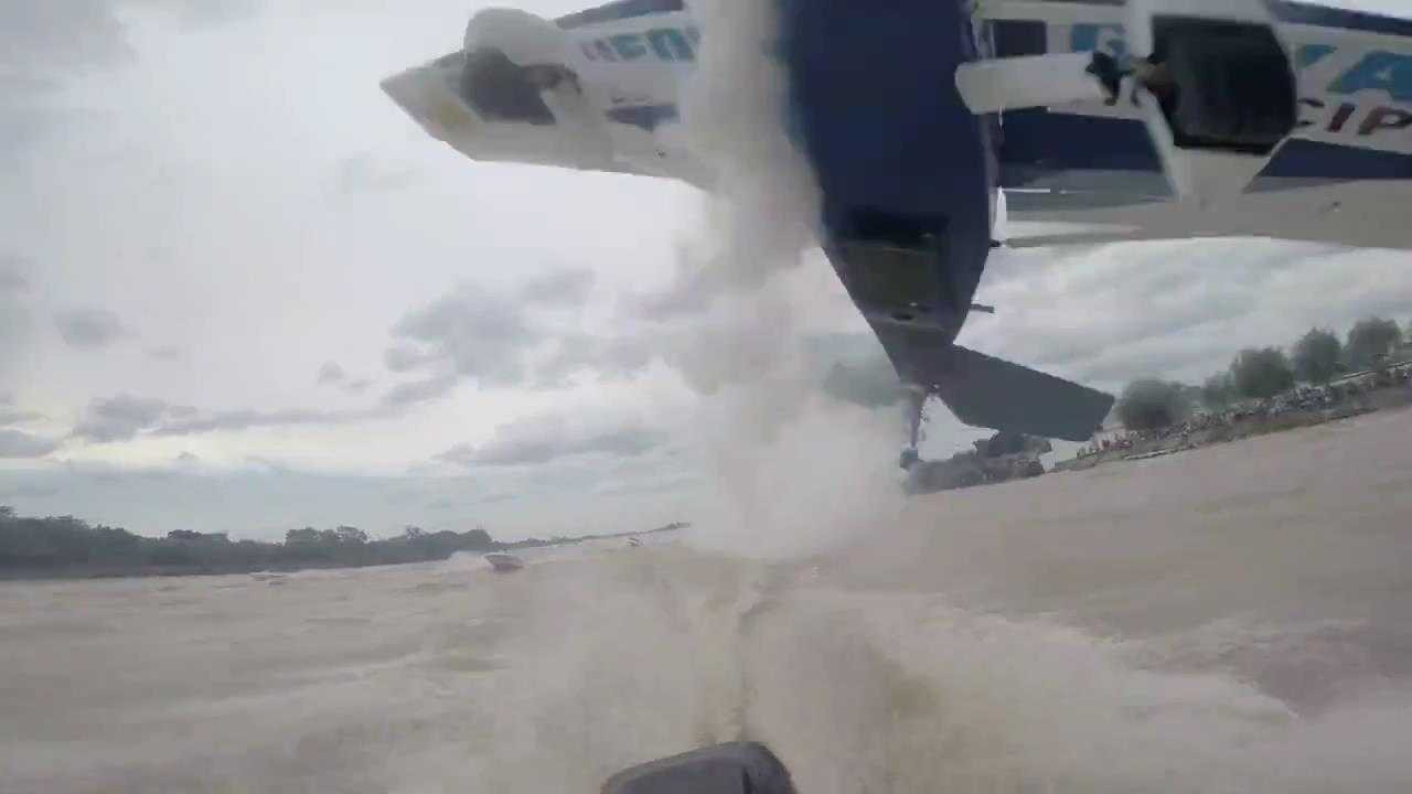3 ngư dân tham gia lễ hội đánh cá ở Fiesta del Surubi, Goya, Argentina được phen 'rụng tim' khi một chiếc máy bay bất ngỡ lao xuống chạm sát đầu họ.