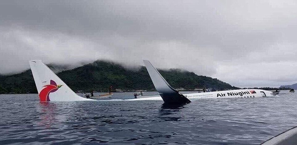 Máy bay lao quá đường băng chìm dưới biển, may mắn tất cả hành khách và phi hành đoàn đều sống sót. (Ảnh: Facebook)