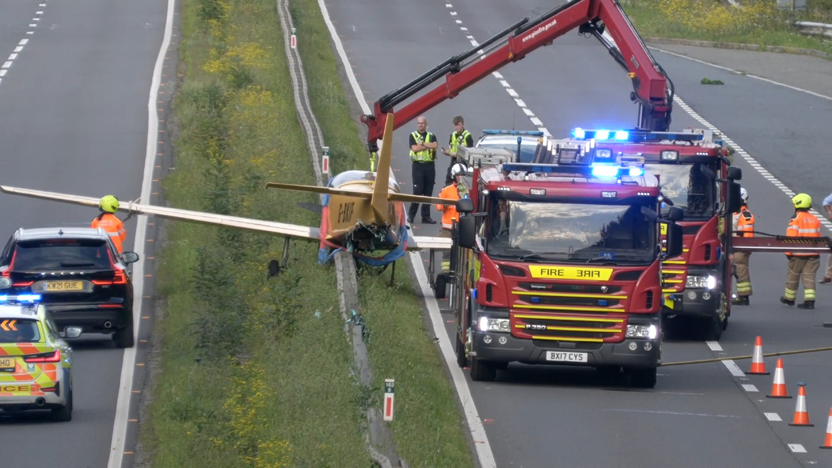 Chiếc máy bay cỡ nhỏ bất ngờ hạ cánh, tông vào thanh chắn và mắc kẹt giữa đường cao tốc tại Cheltenham, Gloucestershire, Vương quốc Anh.