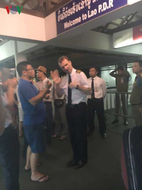 Lúc này, phi hành đoàn mới mời các hành khách mang hết hành lý xách tay xuống sân bay Vientiane (Lào) để chờ khắc phục sự cố và chờ phương án giải quyết của lãnh đạo hãng. Khi ra khỏi máy bay để vào sân bay Lào, hành khách phải chờ chừng 10 phút trên cầu đi bộ để vào nhà chờ trong tình trạng mệt mỏi.