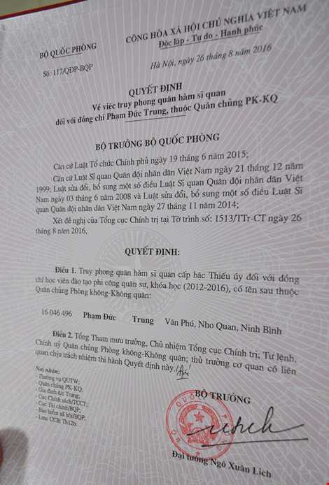 Quyết định của Bộ trưởng Bộ Quốc phòng truy phong quân hàm sĩ quan cấp bậc thiếu úy đối với học viên đào tạo phi công quân sự Phạm Đức Trung.