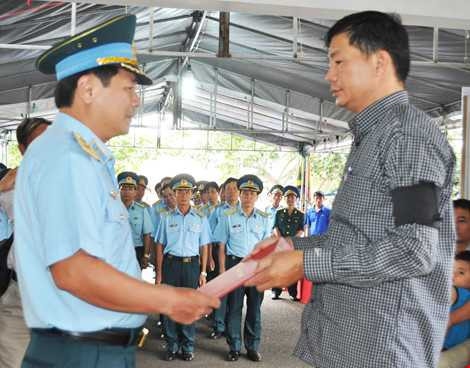 Trung tướng Lê Huy Vịnh, Tư lệnh Quân chủng Phòng không Không quân, trao quyết định của Bộ trưởng Bộ Quốc phòng truy phong quân hàm sĩ quan thiếu úy Phạm Đức Trung cho bố của Trung- Trung tá không quân Phạm Đức Thuận.