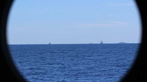 Vòng trong xa hơn một chút có 5-6 tàu trong một tốp đang dàn hàng ngang. 11h35, một tàu hải cảnh rất lớn hú còi, chĩa mũi tàu hướng về phía 2 tàu kiểm ngư Việt Nam.