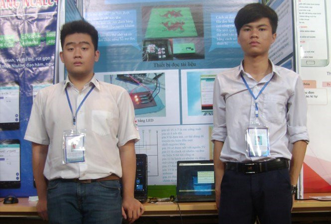 Sau hơn 3 tháng, các em đã nghiên cứu chế tạo ra thiết bị đọc tài liệu dành cho người khiếm thị với sự hướng dẫn của thầy giáo Hồ Hữu Sơn. Về bo mạch chủ 2 em đã tự thiết kế và mua linh kiện về lắp ráp hoàn thành thiết bị. Qua nhiều lần sửa đổi, hoàn thiện từ nhận xét của các bạn học, thầy cô giáo chúng em đã chế tạo thành công thiết bị đọc tài liệu cho người khiếm thị. Chi phí cho sản phẩm khoảng 600 nghìn đồng, rẻ hơn rất nhiều so với các sản phẩm khác có trên thị trường.