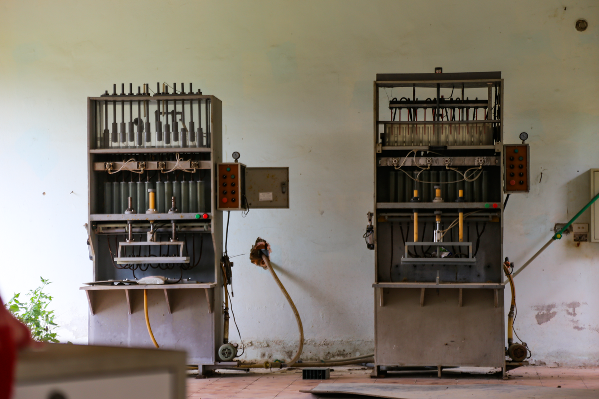 Máy móc hàng tỷ đồng nằm im lìm, phủ đầy bụi trong khu xưởng.
