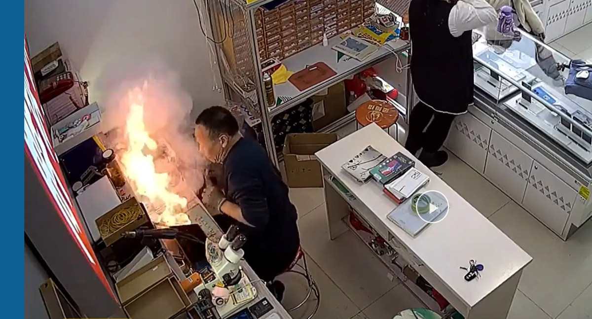 Một người thợ tại tỉnh Hà Bắc, Trung Quốc đang sửa chữa chiếc máy tính bảng bất ngờ bốc cháy dữ dội, người thợ nhanh tay đưa thiết bị ra khỏi khu vực nguy hiểm.