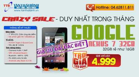 Máy tính bảng HOT nhất năm – Nexus 7 , Google Nexus 7 được trang bị vi xử lý mạnh mẽ 4 nhân tốc độ @1.2Ghz, màn hình HD 7” độ phân giải cao (1280x800), máy chạy hệ điều hành mới nhất Android Jelly Bean 4.2 cùng kết nối NFC, Bluetooth, định vị GPS, Wifi chuẩn N tốc độ cao… 32GB giá như 16GB- GOOGLE NEXUS 7 phiên bản 32GB Wifi Giá CRAZY chỉ còn 4.999.000Đ.