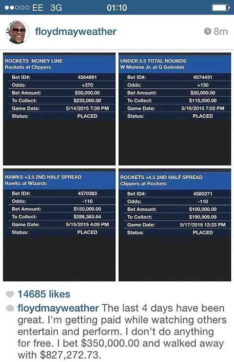 Cũng theo thông tin từ trang cá nhân của Mayweather, số tiền gần 1 triệu USD anh vừa nhận đến trong 4 ngày, từ 14/5 đến 17/5.