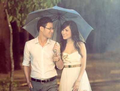 | MC Anh Quân và nữ ca sỹ Kavie Trần trong phân đoạn quay dưới mưa |