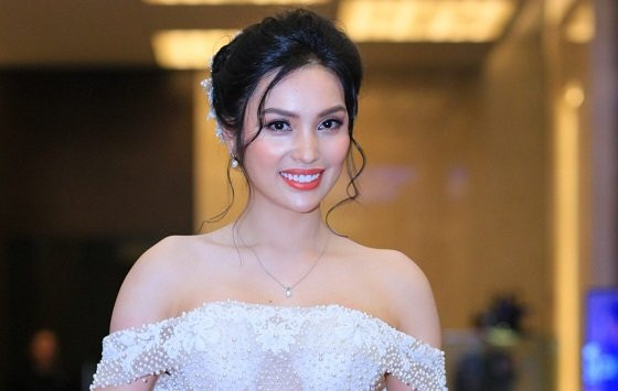 Mới đây, MC Huyền Sâm xuất hiện trong một sự kiện khai trương thương hiệu trang sức. Người đẹp diện váy trắng đính ngọc trai để lộ đôi vai trần cùng vòng một nõn nà, gợi cảm.