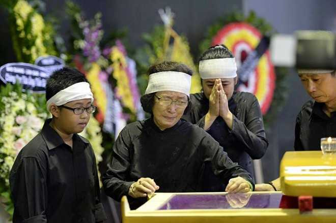 | Sự ra đi bất ngờ của NSND khiến người thân, gia đình bàng hoàng, đau xót. Vợ và các con cháu nức nở bên linh cữu ông. |