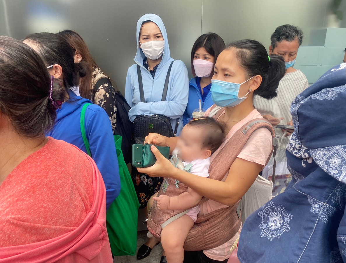 Chị Nguyễn Thanh Xuân (ngụ quận 3) bế theo con nhỏ 8 tháng tuổi đi tố cáo. Chị đã bị nhân viên ngân hàng và công ty bảo hiểm tư vấn sai sự thật và đầu tư vào sản phẩm Tâm An Đầu Tư 200 triệu đồng. Trong khi đó, bản thân chị và gia đình cũng đang gặp khó khăn vì mắc khoản nợ hơn 800 triệu đồng chưa trả hết. (Ảnh: Đại Việt).