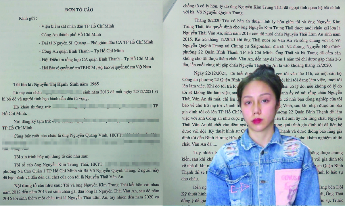 Theo nội dung đơn tố cáo, bà Nguyễn Thị Hạnh (SN 1985, mẹ ruột bé A.) cho biết, năm 2020, vợ chồng bà ly hôn vì ông Nguyễn Kim Trung Thái đã ngoại tình, có quan hệ bất chính với bà Võ Nguyễn Quỳnh Trang nên gia đình thường xuyên lục đục, cãi vã.