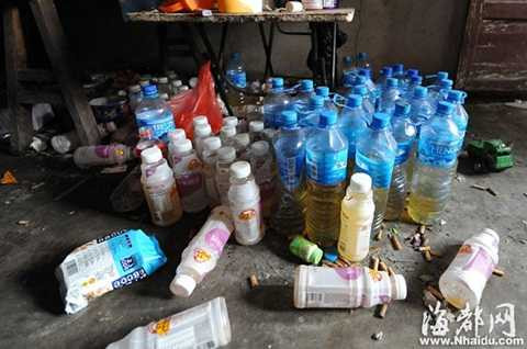 | Vỏ chai nước uống và lọ đựng nước tiểu nằm chỏng chơ trên nền nhà |