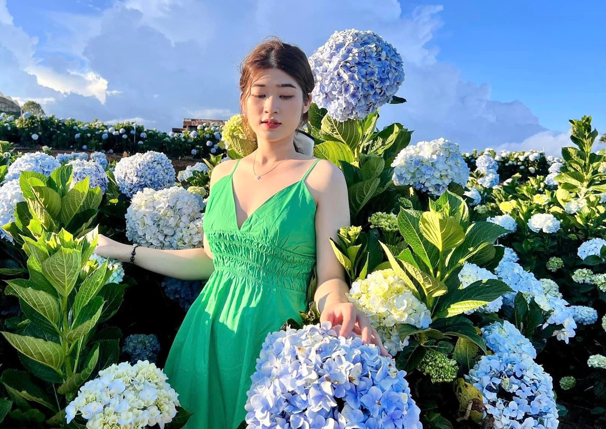 Tranh thủ dịp tới Đà Lạt, chị Thảo chụp lại những hình ảnh đẹp bên hoa cẩm tú cầu.