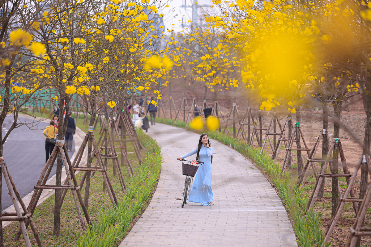 Khi thấy mọi người chia sẻ hình ảnh hoa phong linh trên Facebook, Đỗ Thị Minh (Hà Nội) rủ bạn bè đến đây chụp ảnh. Không chỉ chọn cho mình tà áo dài dịu dàng, Thu còn cất công mượn chiếc xe đạp làm đạo cụ chụp ảnh.