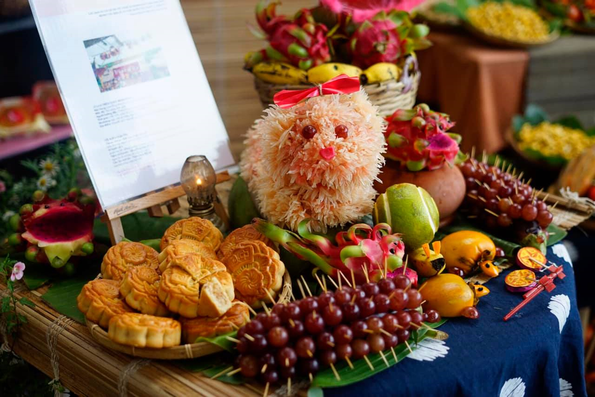 Mâm cỗ đầy phong vị mùa thu với chó bưởi, thị vàng, đèn ông sao, bánh nướng... (Ảnh: Esheep Kitchen)