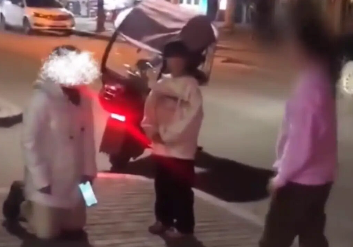 Sự việc xảy ra tại Thái Châu, Chiết Giang, Trung Quốc vào khoảng 8h tối ngày 3/1. Người mẹ quỳ gối ngay trên vỉa hè, trước mặt hai bé gái, khoảng 8 - 10 tuổi và một bé lớn hơn một chút.