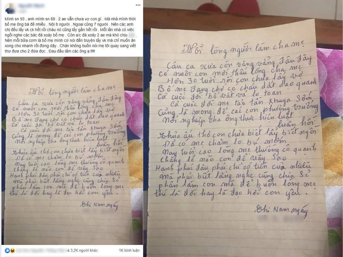 Dưới lời chia sẻ của chàng trai là bức tâm thư mà mẹ gửi cho anh. Theo đó, bức tâm thư này có tựa đề là “Nỗi lòng người làm cha mẹ”. Nội dung bức thư, mẹ anh nhắc nhở con cái về những vất vả mà cha mẹ phải trải qua để nuôi con khôn lớn, ấy vậy nhưng khi đã trưởng thành 2 anh em nhà N.M lại khiến bố mẹ buồn lòng vì mãi không chịu lấy vợ: “Câu ca xưa còn văng vẳng đâu đây. Có nuôi con mới thấu lòng cha mẹ. Hơn 30 tuổi rồi con chưa lấy vợ. Bố mẹ đang chờ có cháu dắt dạo quanh...Hạnh phúc đâu phải chỉ có tiền của nhiều mà phải biết lắng nghe cùng chia sẻ. Phận làm con mà để buồn lòng cha mẹ thì là đời hay là đạo hỡi con yêu".