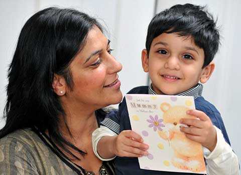 | Bhavna bên cạnh con trai và tấm thiệp suýt khiến cô mù mắt |