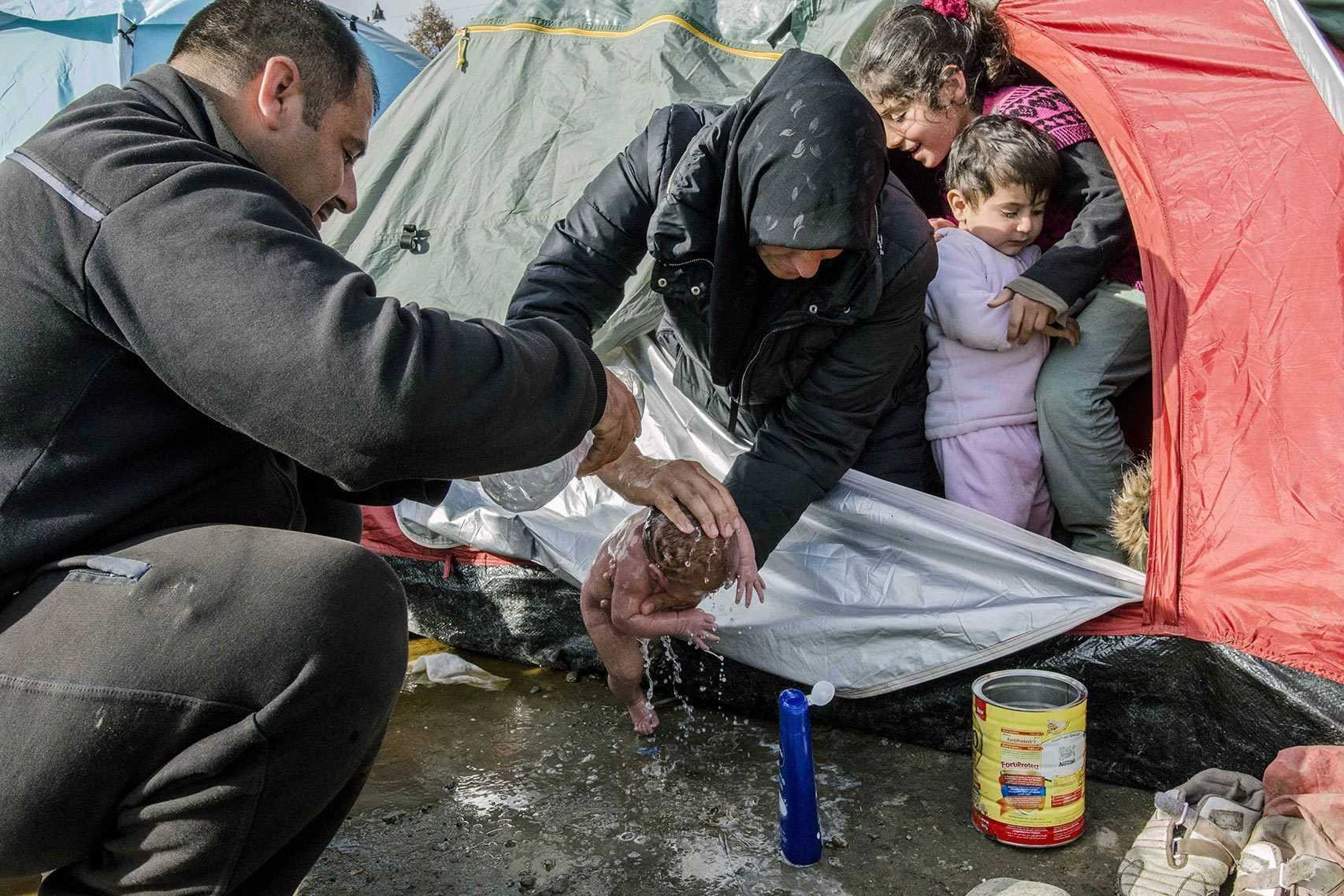 Hình ảnh chấn động này được chụp ở làng Idomeni, Hy Lạp khi người mẹ sinh con ra trong tại tị nạn và em bé buộc phải tắm bằng nước không vô trùng, ngay trên một vũng nước đọng nhiều mối đe dọa.