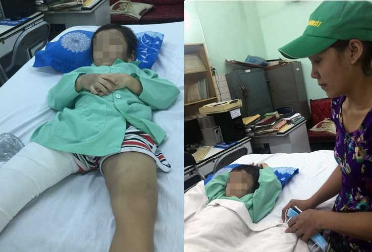Theo bác sĩ Phan Văn Tiếp, Trưởng khoa Chỉnh hình Nhi (Bệnh viện Chấn thương chỉnh hình TP HCM), kết quả chụp X- quang cho thấy Huy bị gãy xương đùi phải, ở 1/3 trên. Cơ thể bé có nhiều vết thâm tím ở đầu, mặt, mình, chân tay. Lúc nhập viện cậu bé được cho uống thuốc giảm đau, cố định vùng gãy.