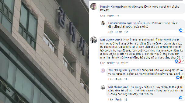 "Ở Việt Nam phụ nữ không bị trầm cảm sau sinh chắc? Em thấy thờ ơ, vô tâm là bệnh của đàn ông rồi, hy hữu lắm mới kiếm được một anh thông cảm, hiểu thấu được tâm trạng của phụ nữ. Không thể quy chụp là vì lấy người Hàn mà tâm lý bị tổn thương đến cùng quẫn mà tự tử được", Ngọc Anh Nguyễn viết.
