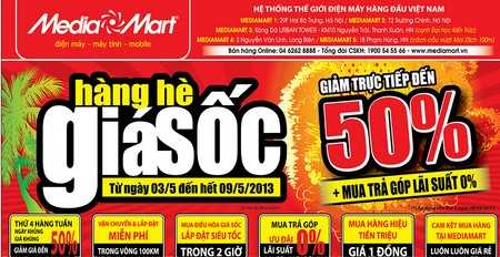 03/05/2013 07:00:00 +07:00(VTC News) - Trước dự báo mùa hè 2013 nắng nóng kéo dài, Media Mart đã chuẩn bị hàng loạt chương trình khuyến mại sốc với các sản phẩm chất lượng.