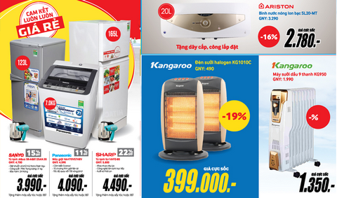 Mùa giảm giá cuối năm cũng là cơ hội sắm sửa cho gia đình một chiếc tủ lạnh hay máy giặt đời mới với mức giá rẻ nhất trong năm. Cụ thể: tủ lạnh 123l Sanyo Aqua SR-AQR125AN.SS giá cực sốc 3.990.000đ tặng thêm máy sấy tóc hoặc bình siêu tốc, máy giặt lồng đứng 7.0kg Panasonic NA-F70VS7HRV giá cực sốc 4.090.000đ tặng thêm máy sấy tóc hoặc bình siêu tốc, tủ lạnh 165l Sharp SJ-16VF2-BS giá cực sốc 4.490.000đ tặng thêm máy sấy tóc hoặc bình siêu tốc…