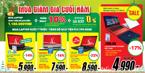 Đặc biệt, với chương trình lần này, Media Mart cùng các hãng giảm giá mạnh cho các model laptop gồm: laptop Asus E402MA-WX0038D model tháng 11.2015 giảm 1 triệu còn 4.990.000đ, laptop Lenovo G4080-80E400QFVN core i3 giảm 1,5 triệu còn 7.590.000đ tặng thêm bộ quà tiện ích 290.000đ, laptop HP 15-AC145TU(P3V11PA) pentium 4 nhân giảm 1 triệu còn 5.990.000đ tặng bộ quà tiện ích trị giá 290.000đ…