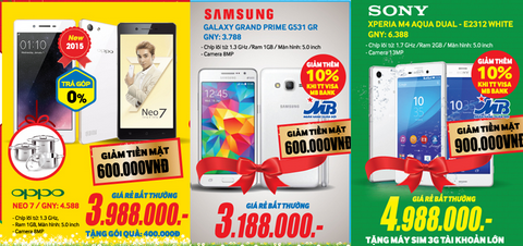 Một số smartphone HOT có giá rẻ bất thường trong đợt này như: Samsung Grand Prime G531 giá chỉ 3.188.000đ, Sony Xperia M4 giá 4.988.000đ, siêu phẩm iPhone 6S có giá thanh toán qua thẻ visa MBBank chỉ 16.999.000đ tặng bộ quà trị giá 1 triệu.