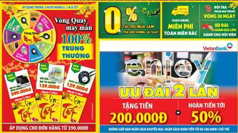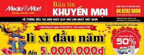 Đặc biệt, từ 24/2 (tức mùng 6 tết) đến hết 6/3, Media Mart tặng tiền lì xì trực tiếp cho hàng nghìn TV LED, smartphone, laptop, máy ảnh, máy tính bảng. nồi cơm điện,lò vi sóng… của các thương hiệu nổi tiếng thế giới. Chưa dừng ở đó, mua sắm tại MediaMart thanh toán qua thẻ tín dụng quốc tế JCB Vietinbank, khách hàng còn có cơ hội hoàn tiền tới 50%, tặng tiền 200.000đ