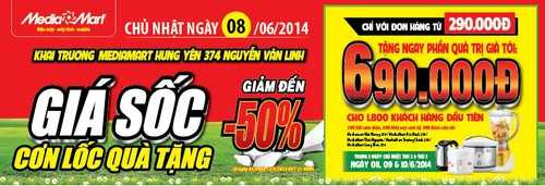 (VTC News) - Sáng Chủ nhật, ngày 8/6/2014, đại siêu thị Điện máy – Nội thất MediaMart Hưng Yên sẽ chính thức được khai trương tại số 374 Nguyễn Văn Linh – An Tảo – Hưng Yên.