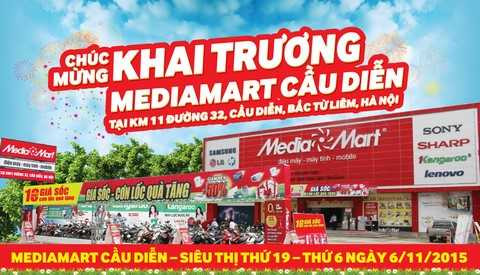 (VTC News) - Sáng thứ 6 ngày 6/11/2015, siêu thị điện máy MediaMart Cầu Diễn sẽ chính thức được khai trương tại Km11 đường 32 - tổ 15 - phường Phúc Diễn - Quận Bắc Từ Liêm. Đây là siêu thị thứ 19 của hệ thống Media Mart trên toàn quốc và là siêu thị thứ 9 tại địa bàn TP Hà Nội.
