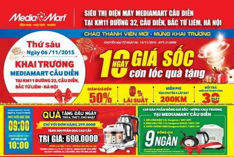 Nhân dịp này, MediaMart mang đến chuỗi chương trình "Giá sốc cơn lốc quà tặng". Theo đó trong 3 ngày vàng từ 6/11-8/11, mua 1 tặng 1 chỉ với đơn hàng 399.000đ, 300 khách hàng đầu tiên của MediaMart Cầu Diễn sẽ được nhận ngay các phần quà trị giá đến 690.000đ đồng gồm nồi cơm điện hay bình siêu tốc cao cấp.