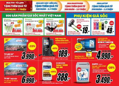 Gây sốc với chương trình khuyến mại trong dịp khai trương này là hàng loạt sản phẩm được bán với giá Siêu rẻ theo từng khung thời gian khác nhau như: TV LED 32’’ giảm trực tiếp 1.5 triệu chỉ còn 3.990.000 đồng; TV LED FULL HD 40” Sharp giá chỉ còn 6,99 triệu; nồi cơm điện Kangaroo 1.8l giảm 49% còn 199.000đ, bếp điện từ Kangaroo giảm 33% còn 399.000đ, máy giặt Sanyo AQUA 7.0kg AQW-S70KT giảm 20% còn 3.490.000đ, laptop sinh viên rẻ hơn máy tính bàn giá chỉ 4.990.000đ, điện thoại di động Samsung Galaxy Y S5360 giảm 49% giá cực sốc 388.000đ, gậy chụp ảnh chỉ 19.000đ, USB Toshiba 8Gb giá sốc 49.000đ…