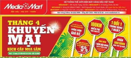 (VTC News) - Phối hợp với các tập đoàn điện tử, ngân hàng… tiên phong mang đến nhiều chương trình kích cầu hiệu quả cho thị trường điện máy, mở rộng sang lĩnh vực kinh doanh nội thất… Media Mart đang ngày một khẳng định sự phát triển nhanh chóng, bền vững với mục tiêu vì khách hàng của mình. Với 5 đại siêu thị cùng 20.000 sản phẩm chính hãng của các thương hiệu nổi tiếng hàng đầu thế giới như: Samsung, Sony, Toshiba, Panasonic, LG... bày bán tại đây, Media Mart được đánh giá là một trong những Hệ thống trung tâm mua sắm điện máy- máy tính -mobile có quy mô hiện đại và lớn nhất thị trường miền Bắc.