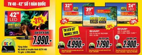 Theo đó, từ 5/7 đến 11/7, chiến dịch giảm giá lên tới 49%, giảm tiếp 5% khi thanh toán qua thẻ Vietinbank thứ 6 chắc chắn sẽ mang tới đợt tới xả hàng lớn nhất mùa hè 2013. Cơn chấn động về giá mở màn với hàng loạt sản phẩm Tivi LED đến từ các thương hiệu lớn như: TV LED SHARP 32'' LC-32LE240M-BL chỉ 4.990.000đ, TV LED FULL HD LG 42LN5110 giá 7.990.000đ, TV LED Sharp 39’’ 39LE440M giảm 26% còn 7.790.000đ… Đặc biệt, Ưu đãi thẻ thành viên Media Mart tặng tới 4000 điểm tương đương 4 triệu đồng tiền mặt cùng phần quà trị giá tới 8.190.000đ khi mua TV LED, 3D từ 32’’ trở lên..