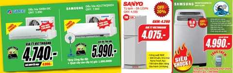 Ngoài ra, các sản phẩm điện lạnh khác được trợ giá mạnh như Tủ lạnh SBS Samsung RSA1WTSL1/XSV giá Vietinbank 17.390.000đ, tủ lạnh 110l Sanyo SR-125PN giá Vietinbank 4.075.000đ, máy giặt lồng đứng 9kg Samsung WA90F5S3QRW/SV giá 4.990.000đ… Với mức giảm giá trực tiếp lên tới 50%, các gian hàng gia dụng tại Media Mart luôn thu hút lượng lớn các chị/ em nội trợ quan tâm, mua sắm. Quạt đứng Midea FS40-S5A giá 390.000đ, máy xay sinh tố Kanagroo 1,5l KG304 giảm 292.000đ còn 298.000đ, nồi cơm điện Panasinic 1,8l SR-TEJ18 chỉ 690.000đ, cây nước Kanagroo KG46 giá Vietinbank 3.790.000đ…