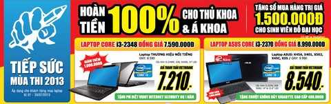 Đồng hành cùng học sinh- sinh viên, Media Mart hoàn tiền 100% cho thủ khoa, á khoa và Tặng sổ mua hàng trị giá 1,5 triệu cho sinh viên trúng tuyển các trường Đại học công lập trong kỳ thi đại học 2013 khi mua laptop tại Media Mart trong thời gian từ 1/7 đến hết 20/7. Chưa dừng ở đó, đến Media Mart các bạn học sinh sinh viên còn được sở hữu những chiếc laptop cấu hình cao với mức giá chỉ bằng máy tính bàn như laptop core i3-2348 giá Vietinbank 7.210.000đ, Laptop Asus core i3 đồng giá Vietinbank 8.540.000đ tặng chuột không dây GiGabyte cao cấp trị giá 490.000đ, Acer Aspire V5-171 core i3 mỏng nhẹ thời trang giá siêu sốc 6.990.000đ…