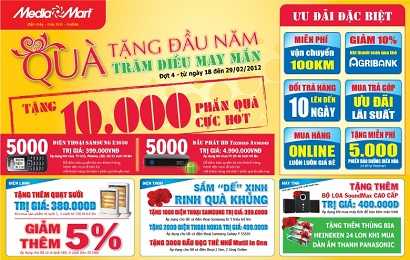 Từ 18/2 cho tới hết tháng 2, khách hàng còn có thêm rất nhiều cơ hội để mua được những sản phẩm chất lượng với mức giá luôn luôn rẻ từ Media Mart. Mặt hàng điện lạnh đồng loạt được giảm 5% giá bán, tặng thêm quạt sưởi cho một số model tủ lạnh. Trong nhóm ngành hàng kỹ thuật số, với đơn hàng chỉ từ 300.000 đồng người mua đã được tặng thêm quà, riêng mặt hàng đồng hồ đeo tay còn tới 30%.