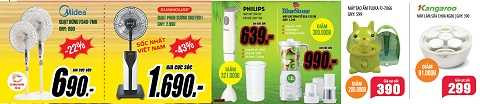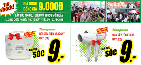 Tâm điểm của “10 ngày đại hạ giá” đợt này là loạt gia dụng đồng giá 9000 đồng được bán vào lúc 10h, 16h, 19h30 mỗi ngày. Cụ thể, khách hàng sẽ được mua Nồi cơm điện Kangaroo KG376NT giá thị trường 390.000đ, giá giờ vàng tại MediaMart chỉ 9000 đồng, máy sấy tóc Kangaroo KG615 giá thị trường 229.000đ, giá giờ vàng tại MediaMart chỉ 9000 đồng.