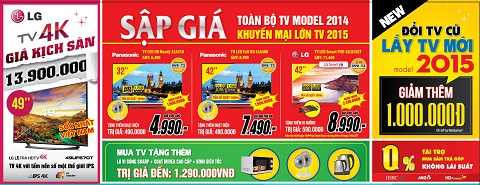 Cũng trong dịp này, MediaMart thực hiện sập giá toàn bộ TV model 2014 và khuyến mại lớn TV 2015 cùng nhiều chính sách đổi TV cũ lấy TV mới 2015: LED 32’’ Panasonic 32A410 giảm 1,5 triệu còn 4.990.000đ tặng thêm quạt điện trị giá 490.000đ, thậm chí những model TV cao cấp cũng có mức giá gây náo loạn thị trường điện máy như TV 4K 49’’ LG 49UF670T chỉ 13.900.000đ… Khám phá kỷ nguyên màu sắc mới dòng sản phẩm 2015, MediaMart tặng ngay phiếu mua hàng 1 triệu khi mua TV Samsung: LED 32’’ Samsung 32H4100K giảm 2 triệu còn 4.990.000đ, Smart TV 40’’ Samsung 40H5562 giảm 2,4 triệu còn 9.490.000đ tặng 12 tháng thuê bao truyền hình An Viên..