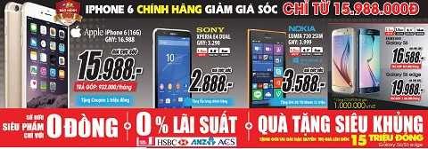 Đây cũng là thời điểm vàng để sở hữu những siêu phẩm công nghệ với chương trình trả góp 0 đồng, 0% lãi suất cùng quà tặng siêu khủng. Với mức giá 15.988.000đ, iPhone 6 chính hãng đang có giá tốt hơn bao giờ hết. Nhanh chóng có mặt tại MediaMart, siêu phẩm Samsung Galaxy S6 và S6 Edge lần lượt có mức giá là 16.588.000đ và 19.988.000đ cùng gói quà khủng.
