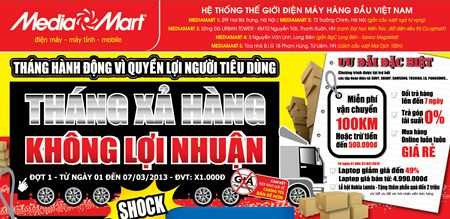 (VTC News) - Xuyên suốt tháng 3/2013, Hệ thống thế giới Media Mart thực hiện chương trình “Xả hàng không lợi nhuận” nhằm tạo điều kiện cho người tiêu dùng có cơ hội mua sắm các sản phẩm chính hãng, đảm bảo chất lượng và giá thành tốt nhất.