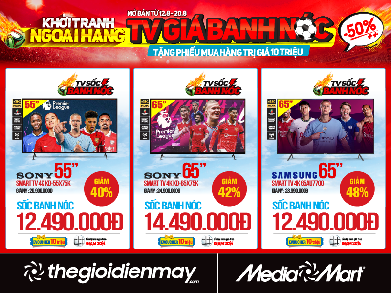 Cụ thể, trong chương trình “Ngoại hạng Anh khởi tranh - Tivi giá banh nóc” từ 12.8 đế hết ngày 20.8 ngoài mức giảm mạnh, siêu thị điện máy MediaMart còn áp dụng nhiều khuyến mại như: tặng evoucher mua sản phẩm Coex, Roler trị giá 10 triệu đồng; giảm thêm 20% khi mua kèm giá treo tivi; tặng loa thanh trị giá 7,49 triệu đồng khi mua các sản phẩm.